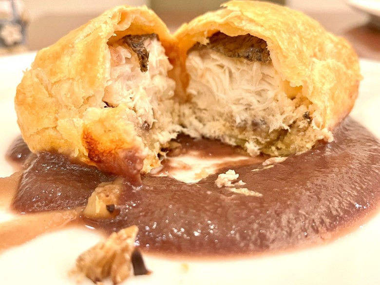 Tourte de daurade et châtaignes sauce vin rouge