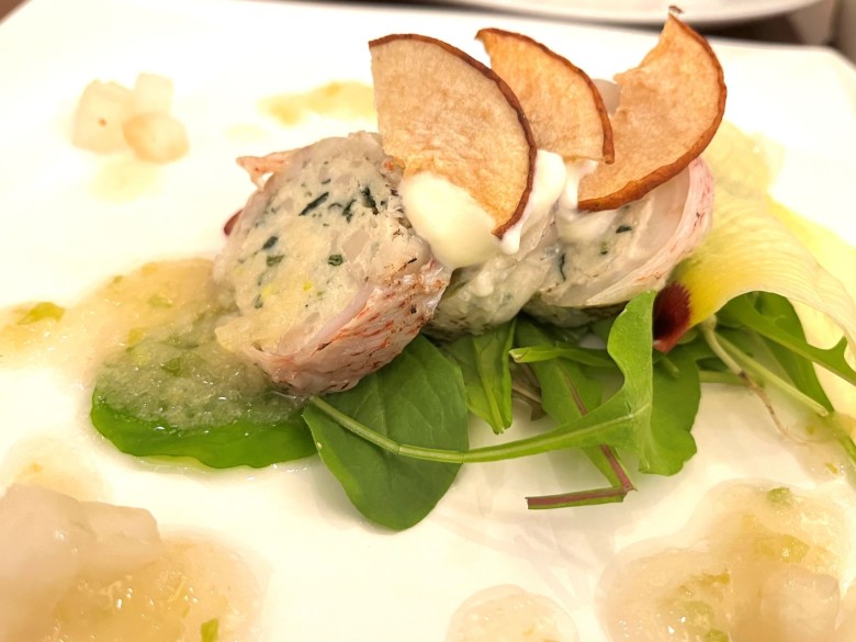カサゴのタンバル仕立て 白葱と梨のソース