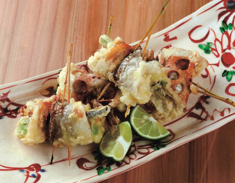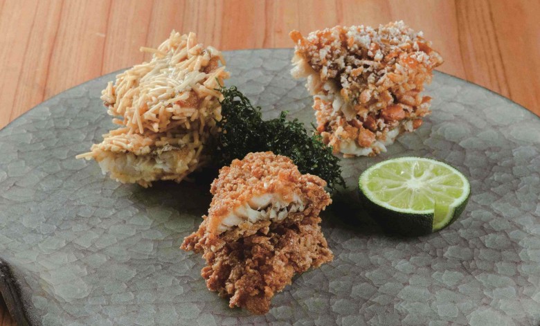 玄米フレーク、そうめん、柿の種を衣にして揚げました