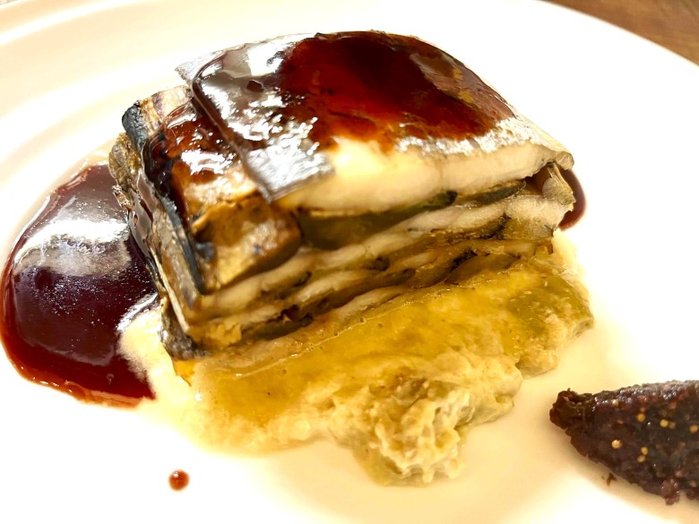 太刀魚と焼き茄子のミルフィーユ ドライイチジクの赤ワインソース