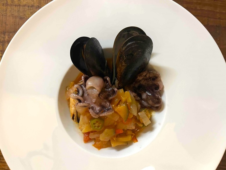 舌平目、イイダコ、瀬戸内ムール貝から出る海鮮の出汁とラタトゥイユで濃縮された夏野菜のうま味が重なり合う濃厚なスープでした。