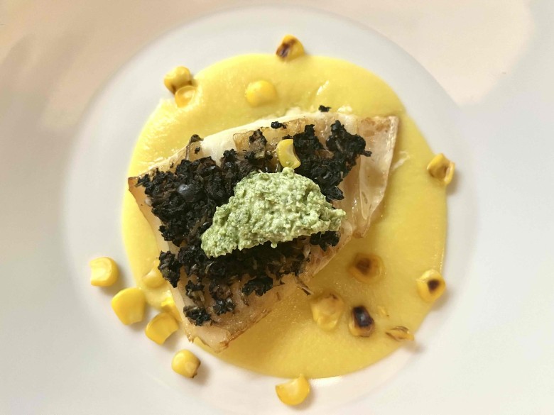 カワハギの燻製オリーブ焼き トウモロコシのソース