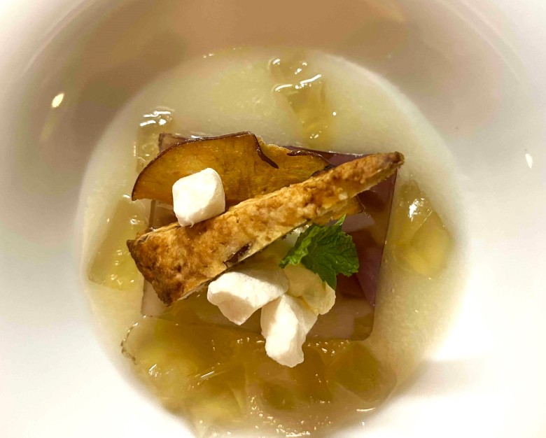 世羅産幸水梨の2色のワインコンポートのゼリー寄せ 幸水梨のスープ