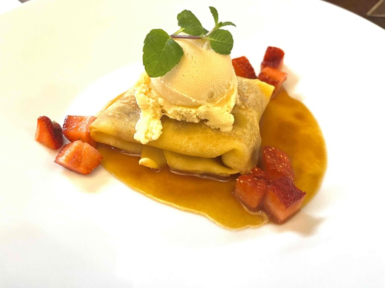 スイートポテトクリームのクレープとリンゴのキャラメルソースを合わせて、フレッシュなあまおう苺も楽しめる贅沢なデザートでした。