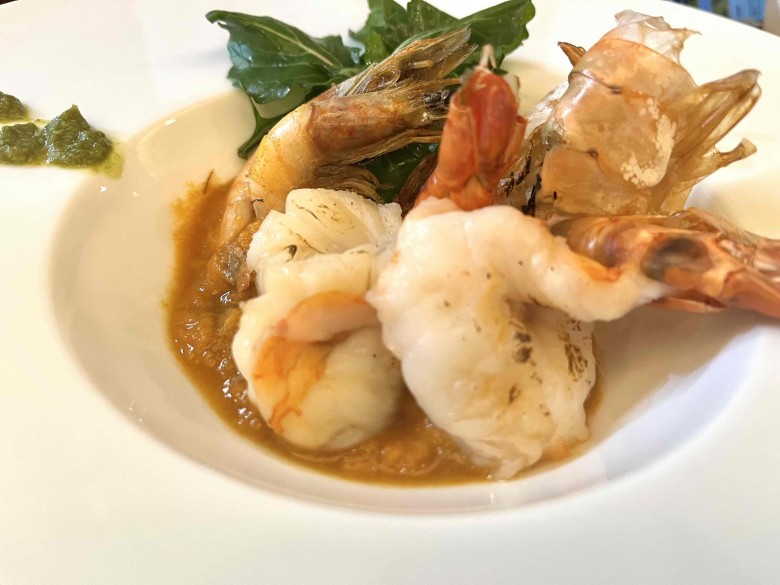 鬼手長海老と芝海老のビスク ルッコラのアクセント