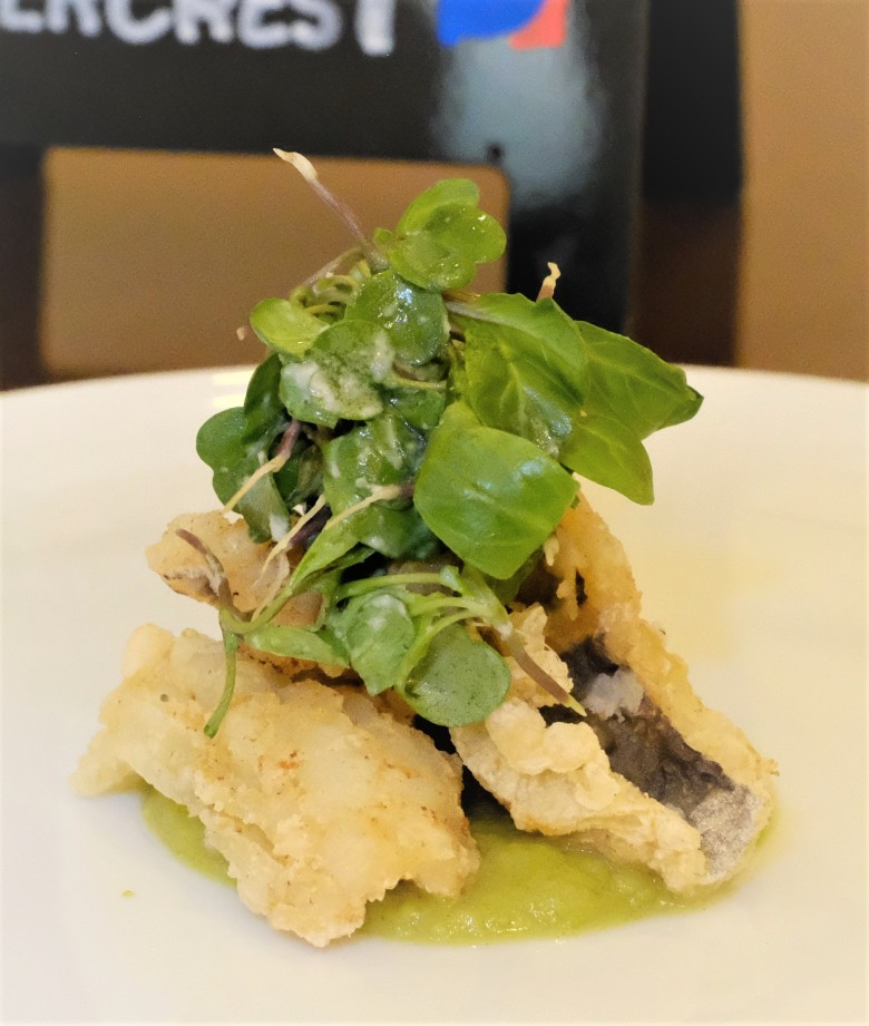 "HAMO" frit sauce gaspacho aux courgette et "yamanomannakanoyamada"microfeulle de roquette